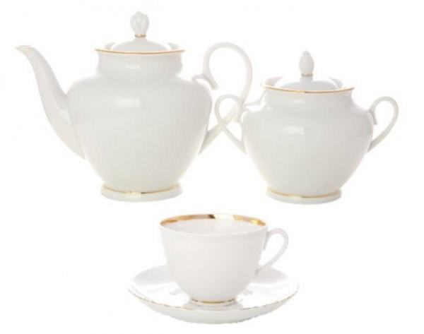 Сервиз включает в себя 14 предметов: чайник, сахарница, 6 чашек (250 мл), 6 блюдец.