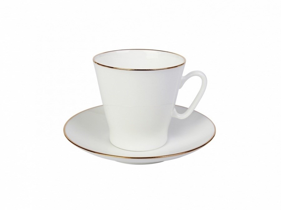 Чашка с блюдцем кофейная рис. Золотой кантик изготовлена на Императорском фарфоровом заводе из костяного фарфора с отводкой золотом вручную. Автор формы - Криммер Э.М. Объем изделия - 80 мл.