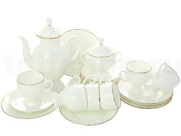 Изысканная отводка, нанесенная натуральным золотом, деликатно обыгрывает белоснежную поверхность изделий, дополняет легкий, светлый образ, подчеркивает хрупкость материала, изящную форму предметов и благородство фарфорового ансамбля.
