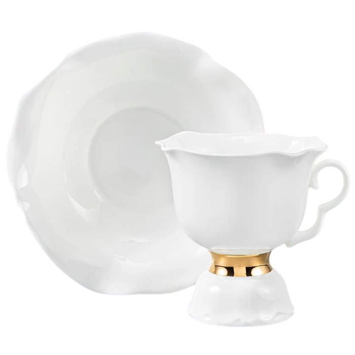 Сервиз чайный форма "Молодежная" рисунок "Золотая лента" изготовлен на Императорском фарфоровом заводе из костяного фарфора. Изысканная отводка, нанесенная натуральным золотом, деликатно обыгрывает белоснежную поверхность изделий, дополняет легкий, светлый образ, подчеркивает хрупкость материала, изящную форму предметов.