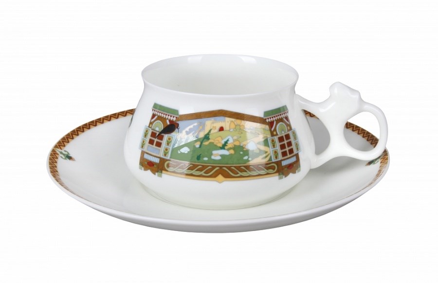 Роспись чашки выполнена художником Владимиром Богдановым по мотивам книжной графики выдающегося русского художника Ивана Билибина.