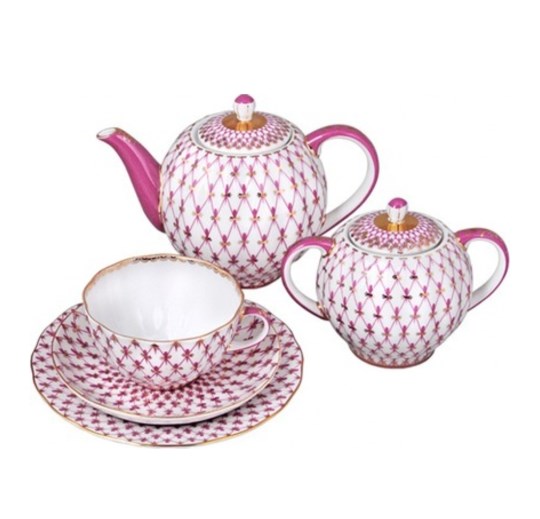 Декор чайного сервиза «Сетка-Блюз» был создан заслуженным художником России Галиной Дмитриевной Шуляк и изначально являлся новой интерпретацией «кобальтовой сеточки», ставшей признанной классикой Императорского фарфорового завода. Розовый цвет отсылает к прообразу этого легендарного мотива – сервизу «Собственный», созданного в середине XVIII века для императрицы Елизаветы Петровны. Автором сервиза стал талантливый русский ученый, открывший для России рецептуру «белого золота», — Дмитрий Виноградов.