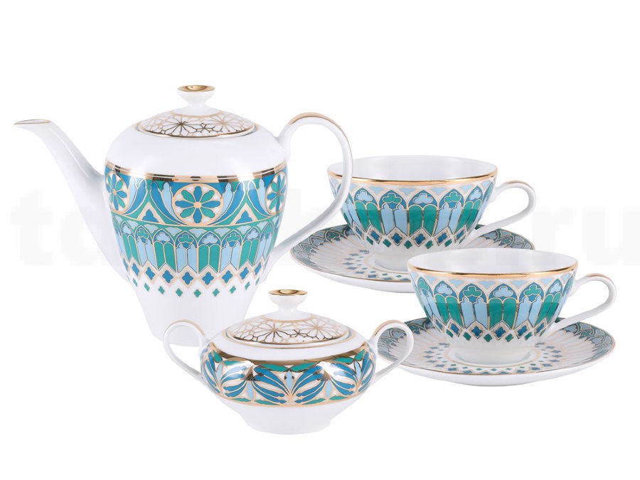 14 предметов на 6 персон: чайник (1150 мл), сахарница (340 мл), 6 чашек (230 мл), 6 блюдец.