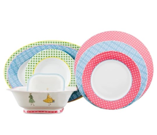 Сервиз включает в себя 24 предмета: 6 десертных тарелок, 6 глубоких тарелок, 6 обеденных тарелок, 2 овальных блюда, 3 салатника, круглое блюдо.