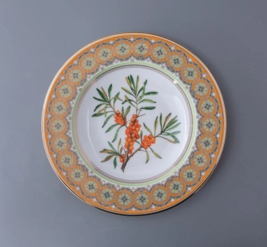 Облепиха сибирская – настоящая драгоценность в природной сокровищнице сурового Урала и Сибири. Облепиха знаменита своими полезными плодами яркого золотистого цвета, которые укрепляют здоровье и восстанавливают жизненную энергию. Эти солнечные ягоды стали символом изобилия, благополучия и усердия. А в славянских традициях облепиха считается символом удачи и процветания. Декоративная тарелка «Облепиха сибирская» вошла в продолжение коллекции «Цветы и ягоды России» от художника Ольги Будашовой. В своих работах автор зачастую изображает цветы и дары природы, – такой декор остается вне времени. Используя растительные мотивы, Ольга Будашова создает предметы, которые сочетают в себе искусство и практичность. Композиция на фарфоре, выполненная в эстетике винтажных ботанических иллюстраций, дополнена орнаментальным узором – авторским размышлением на тему национальной вышивки.