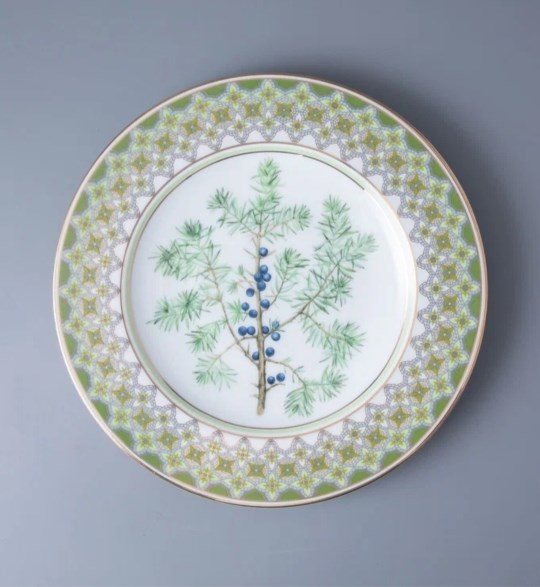 Вечнозеленый можжевельник можно встретить по всей России: от горных лесов Кавказа до берегов Тихого океана. Это растение известно своей стойкостью к суровому климату и символизирует мужество, выносливость и долголетие. Ароматные темно-синие шишкоягоды можжевельника славятся своим горьковатым вкусом с хвойными, смолистыми нотами. А еще в славянской культуре они служат оберегом от злых сил. Декоративная тарелка «Можжевельник ароматный» вошла в продолжение коллекции «Цветы и ягоды России» от художника Ольги Будашовой. В своих работах автор зачастую изображает цветы и дары природы, – такой декор остается вне времени. Используя растительные мотивы, Ольга Будашова создает предметы, которые сочетают в себе искусство и практичность. Композиция на фарфоре, выполненная в эстетике винтажных ботанических иллюстраций, дополнена орнаментальным узором – авторским размышлением на тему национальной
