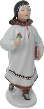 Скульптура Якутка с цветком изготовлена на Императорском фарфоровом заводе из твердого фарфора в технике ручной рописи. Автор формы - Велихова С.Б. Высота скульптуры - 190 мм.