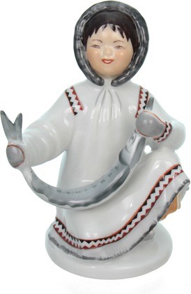 Скульптура Якутка с севрюгой изготовлена на Императорском фарфоровом заводе из твердого фарфора в технике ручной рописи. Автор формы - Велихова С.Б. Высота скульптуры - 138 мм.
