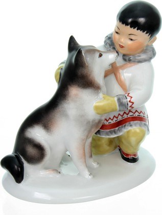 Скульптура Якут с собакой изготовлена на Императорском фарфоровом заводе из твердого фарфора в технике ручной рописи. Автор формы - Велихова С.Б. Высота скульптуры - 136 мм.