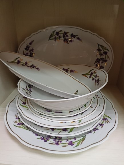 Сервиз столовый Лаванда Отводка золотом, 28 предметов. Форма: Аппетитный Вырезной край Материал: Высококачественный прочный твердый фарфор Тип декора: Ручная роспись, 24 - каратное золото Предметы столового сервиза на 6 персон: Тарелка мелкая 175 мм (десертная) - 6 шт. Тарелка мелкая - 200 мм (подставная) - 6 шт. Тарелка мелкая мелкая 240 мм (обеденная) - 6 шт. Тарелка глубокая 240 мм (глубокая) - 6 шт. Блюдо круглое 300 мм - 1 шт. Блюдо овальное 350 мм - 1 шт. Салатник круглый 1200 мл - 1 шт. Селёдочница 300 мм - 1 шт.